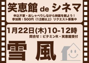 - 次回・01/22(木) K・交流【笑恵館deシネマ】(4木)リクエスト 笑恵館deシネマは、みんなでワイワイ映画を… 続きを読む: 次回・01/22(木) K・交流【笑恵館deシネマ】(4木)
