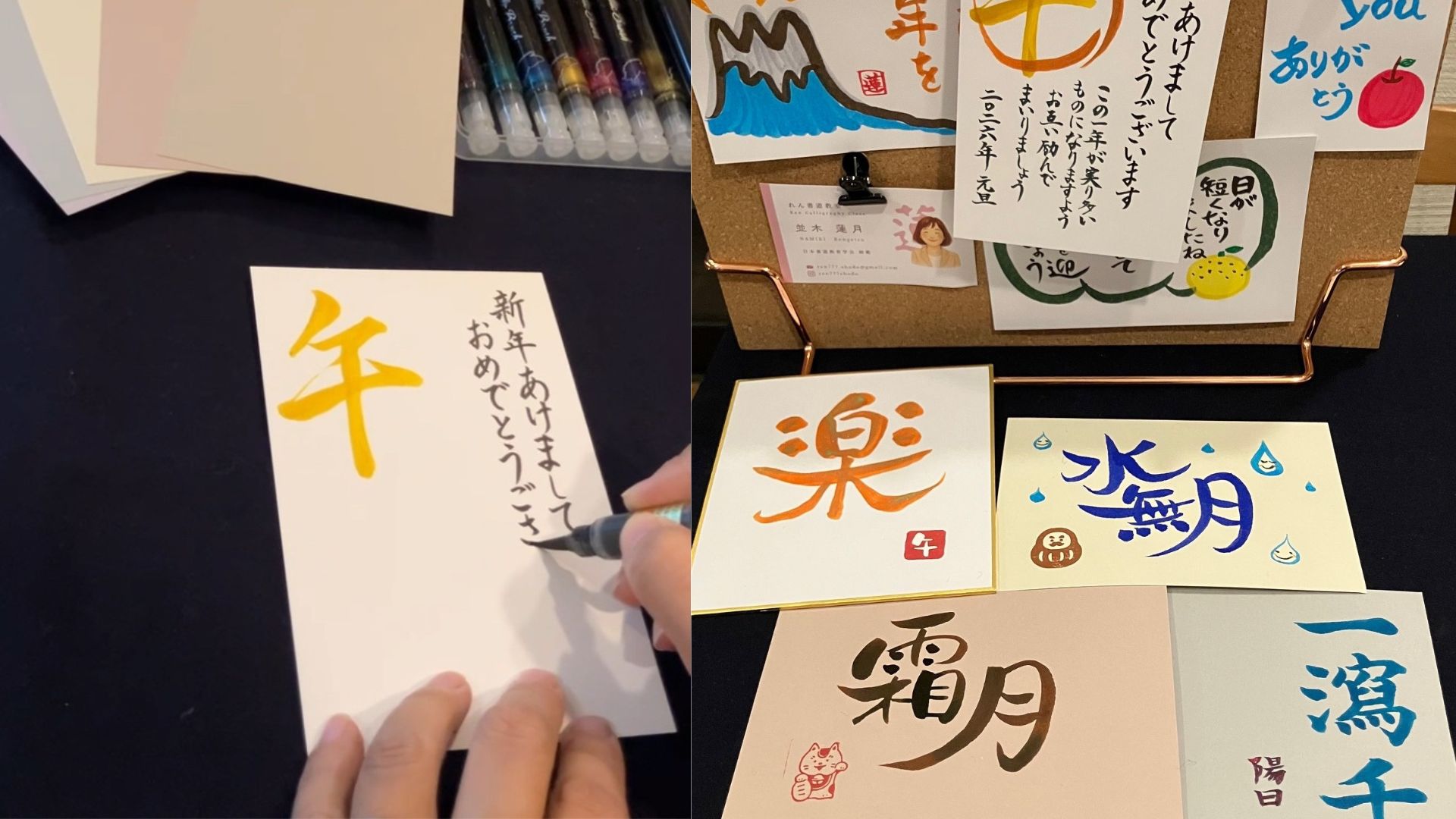 はがきサイズ用紙やミニ色紙にカラー筆ペンで書いてみました。